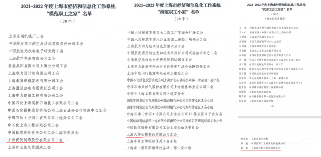 近日,上海市经济和信息化工作系统工会工作委员会下发文件,对下属近百家基层单位工会组织进行表彰,国药AG尊龙凯时工会喜获2021-2022年度“模范职工之家”荣誉称号,国药天伟分工会喜获2021-2022年度“模范职工小家”荣誉称号,国药AG尊龙凯时后勤保障部主任盛青喜获2021-2022年度“优秀工会工作者”荣誉称号。